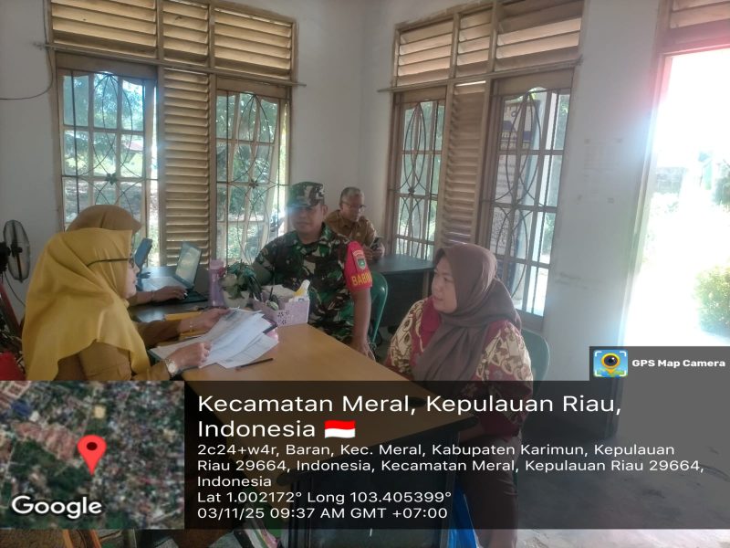 Kegiatan berlangsung sekitar pukul 10.00 WIB di rumah Ibu Emilia, warga RT 003/RW 002, Kelurahan Baran Timur, Kecamatan Meral. Dalam kesempatan tersebut, Babinsa membantu warga dalam proses pembuatan surat keterangan tidak mampu, sebagai bentuk kepedulian terhadap kebutuhan administrasi masyarakat kurang mampu.