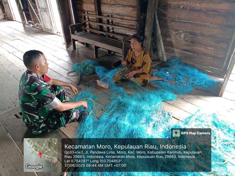 Dalam kesempatan tersebut, Serda Harahap berinteraksi dengan warga yang sedang bekerja menjahit jaring ikan, salah satunya dengan Ibu Sulastri (54), warga RT 001/RW 003 Kelurahan Moro.
