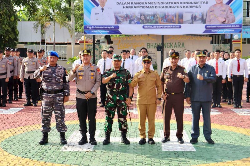 Peserta apel terdiri dari personel Polres Karimun, Kodim 0317/TBK, Bhabinkamtibmas, serta seluruh camat, lurah, dan perangkat desa se-Kabupaten Karimun.