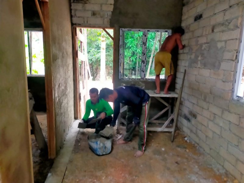 Sertu Arifin Bersama Warga Gotong Royong Memplester Rumah Ibu Zahara di Desa Tanjung Hutan
